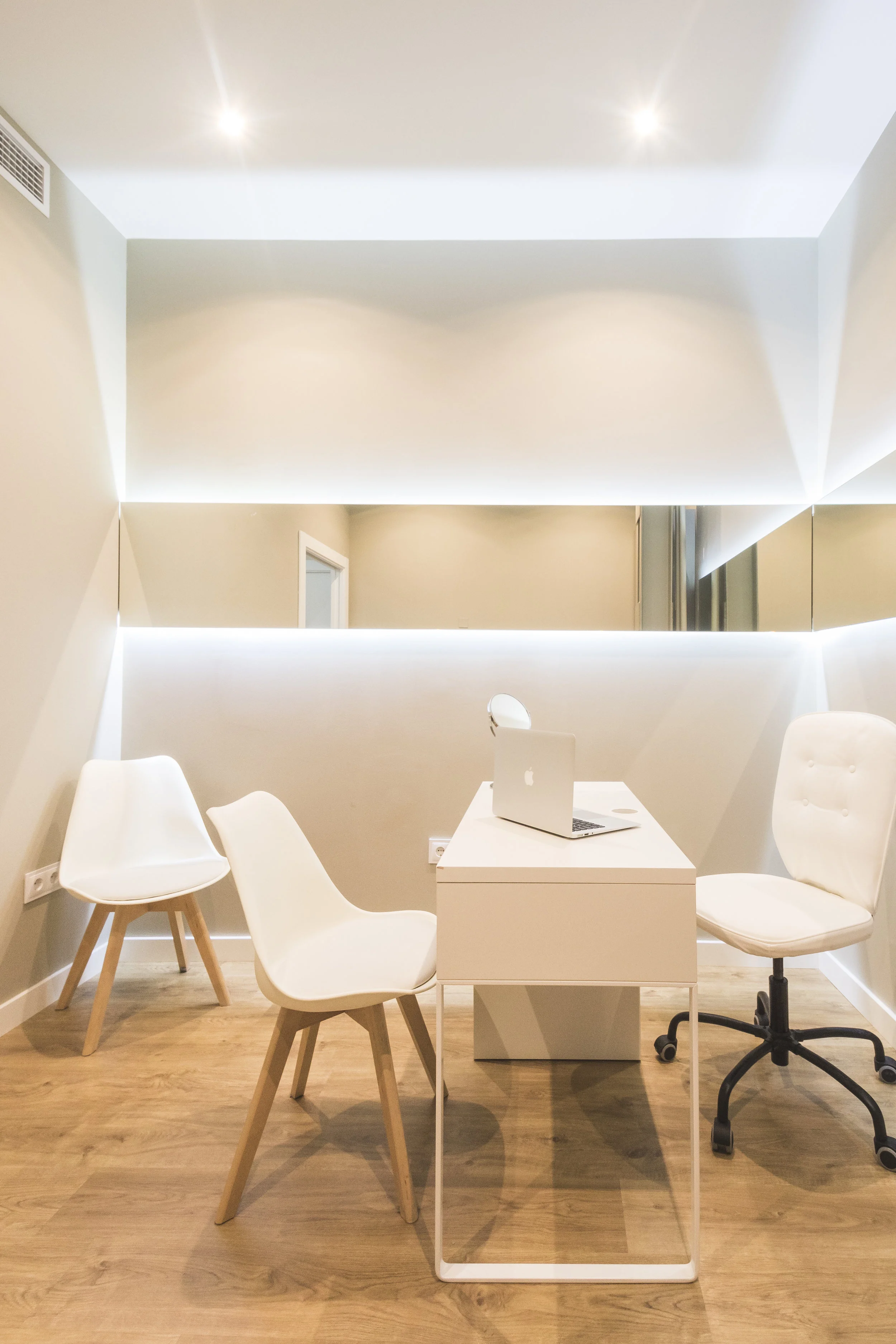 El objetivo de esta clínica era optimizar los metros cuadrados y el presupuesto para conseguir el mejor resultado posible. La dificultad de la falta de luz natural se solventó con iluminación indirecta y el uso de espejos y colores neutros.